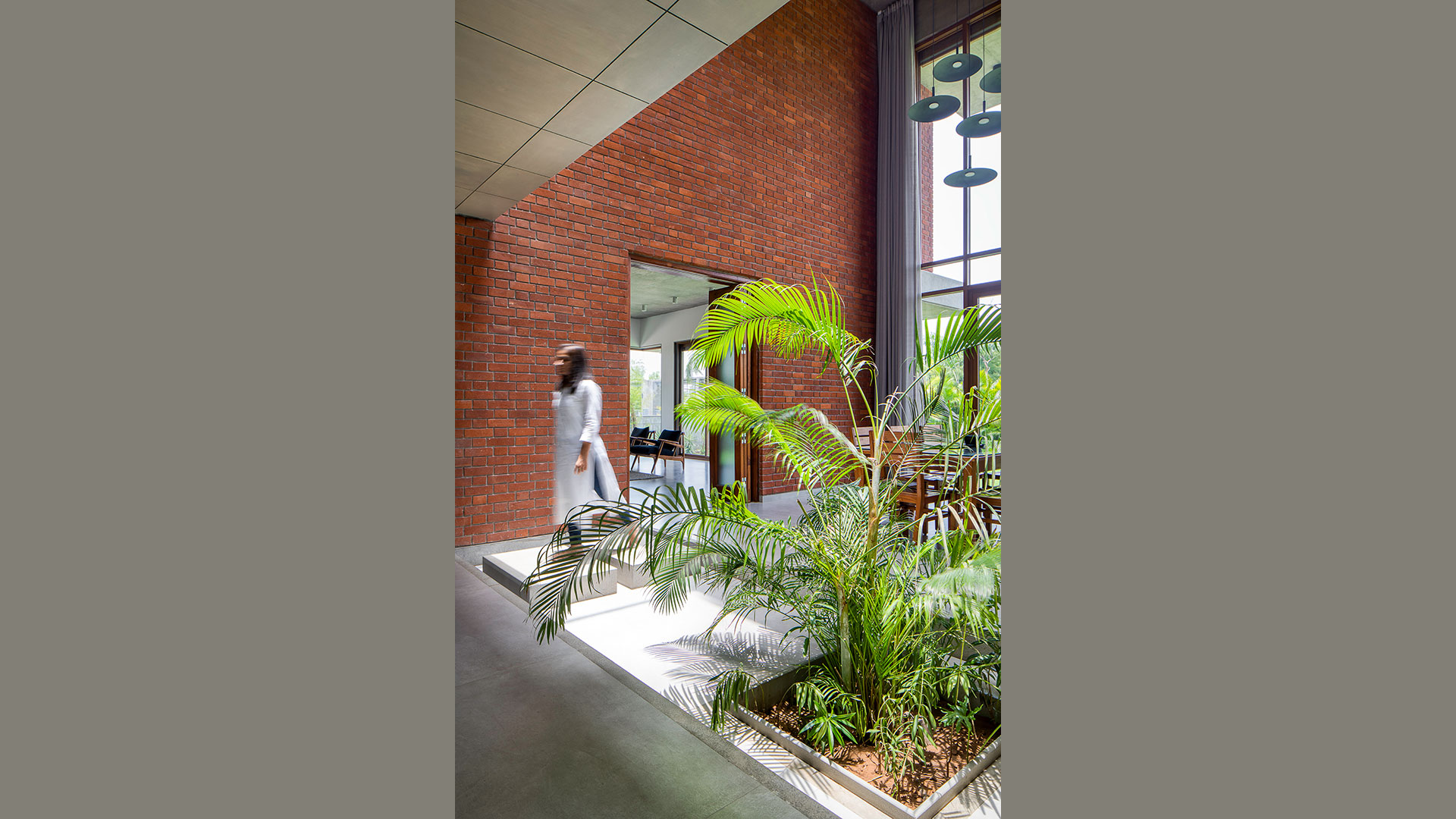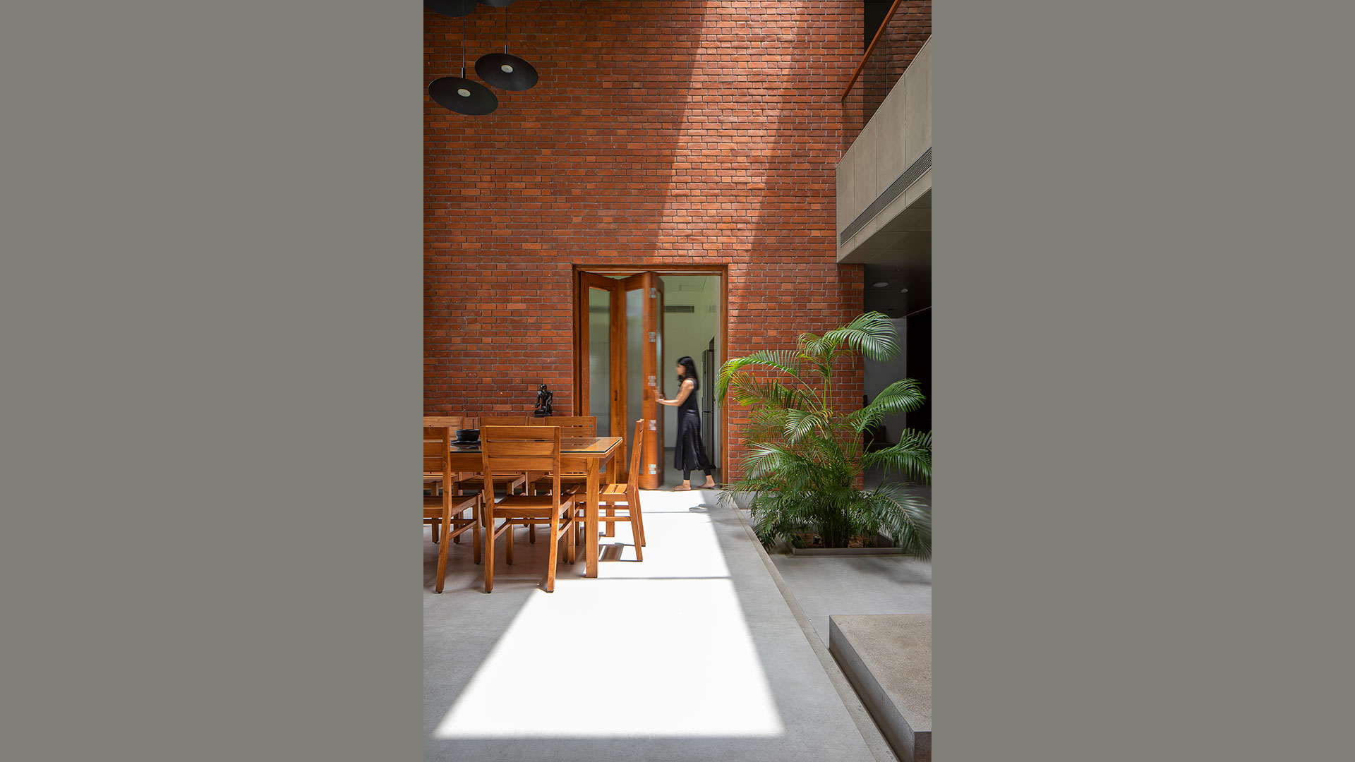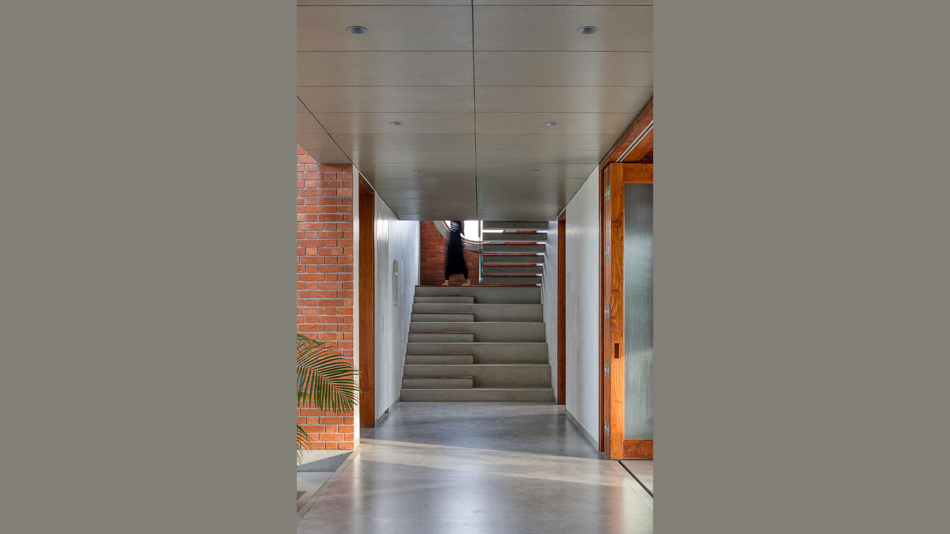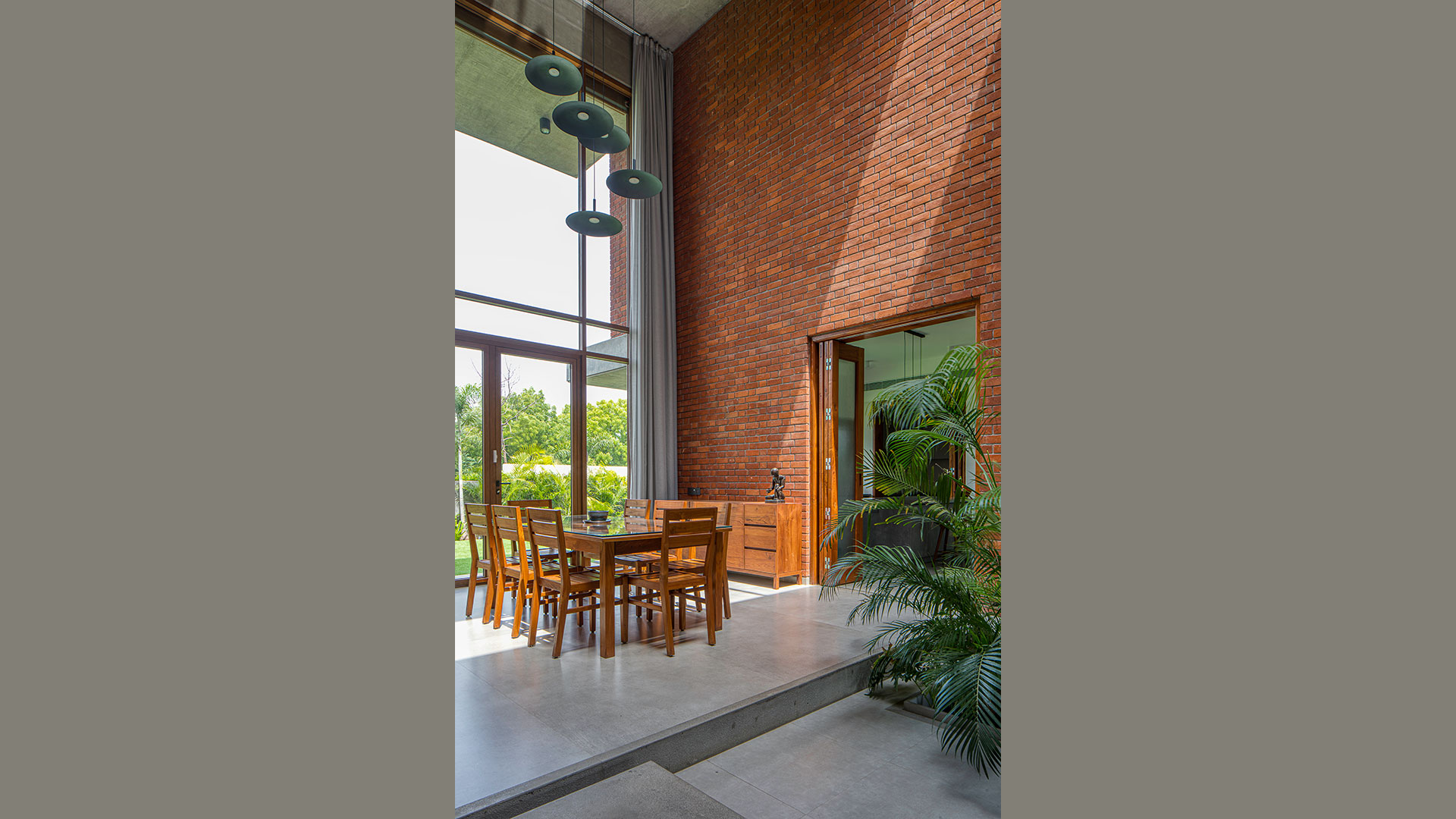In sync with the concept of planning, the exterior is a simple geometry comprising of a bold brick mass with exposed concrete overhangs and large openings. To break this organization, an interesting circular silhouette is introduced in the facade. This element is then explored further in the house wherever a break of monotony is quintessential.